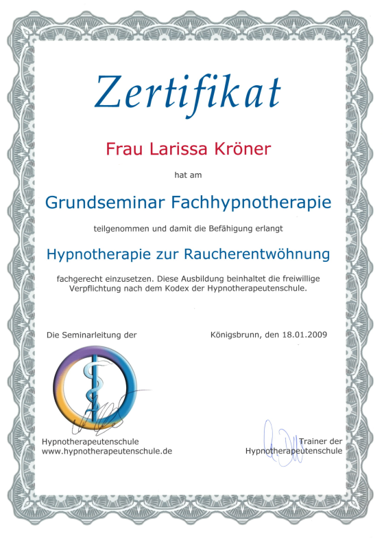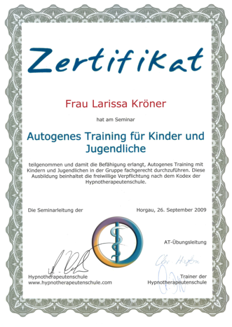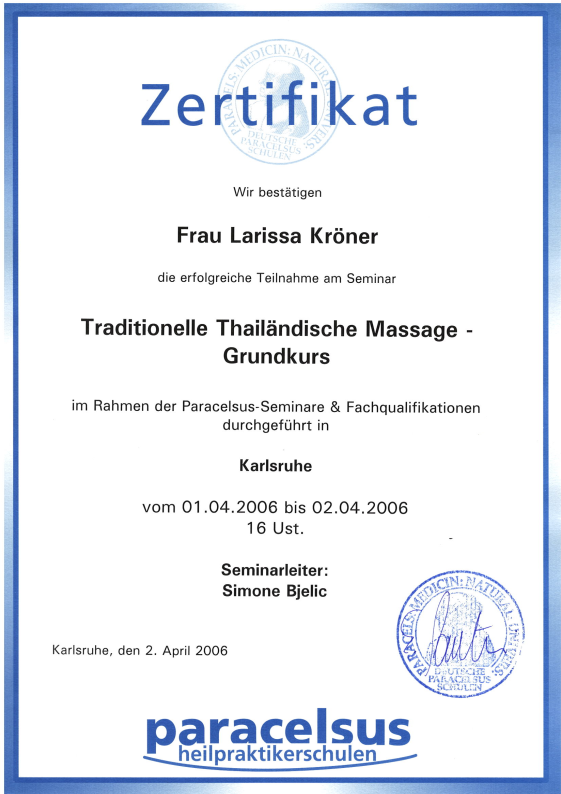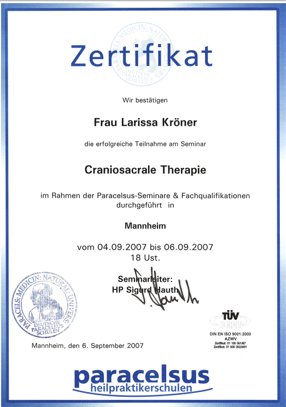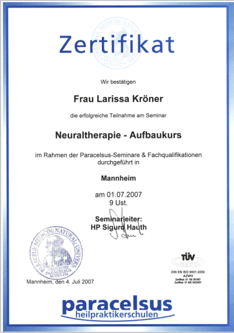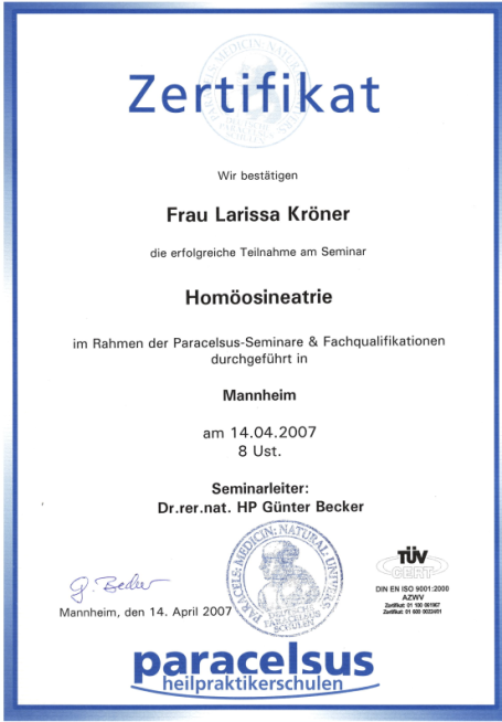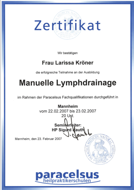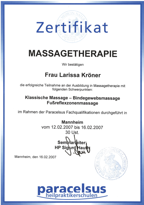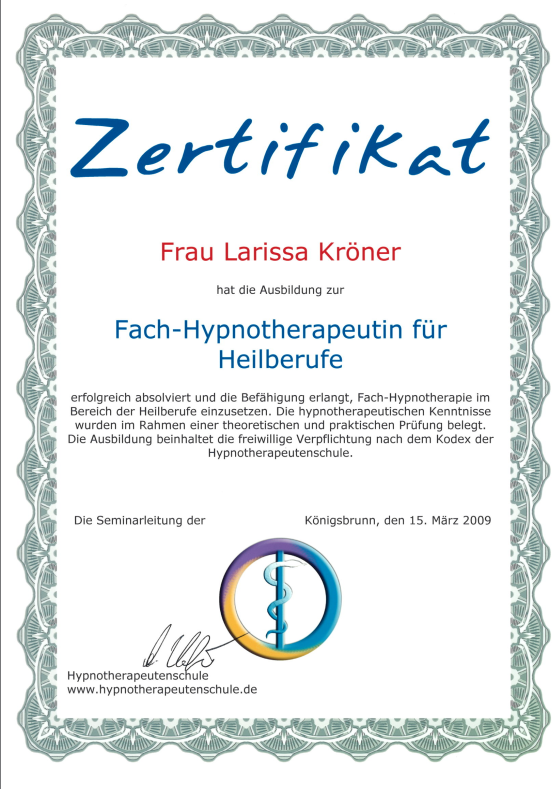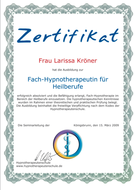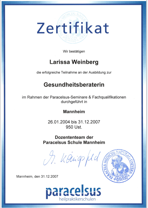 Neben ihrer medizinischen Ausbildung als examinierte Krankenschwester absolvierte Larissa Weiterbildungen im Bereich Gesundheitsberatung, unter anderem an der Paracelsus Schule. Ergänzt wird dies durch weitere Qualifikationen in den Bereichen Hypnose, Psychokinesiologie, Massage und körperorientierter Arbeit.